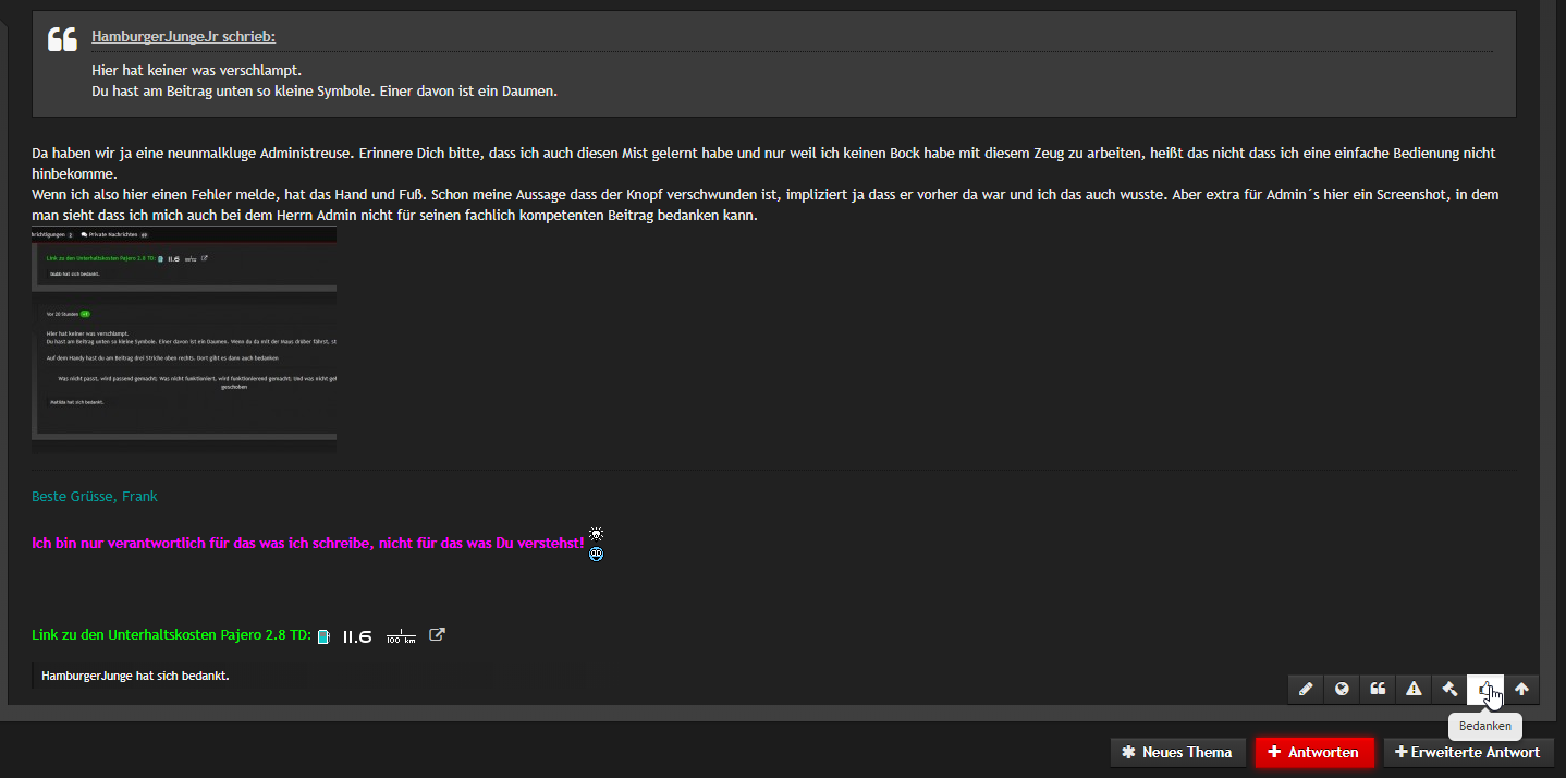 Wenn ich also hier einen Fehler melde, hat das Hand und Fuß. Schon meine Aussage dass der Knopf verschwunden ist, impliziert ja dass er vorher da war und ich das auch wusste. Aber extra für Admin´s hier ein Screenshot, in dem man sieht dass ich mich auch bei dem Herrn Admin nicht für seinen fachlich kompetenten Beitrag bedanken kann.