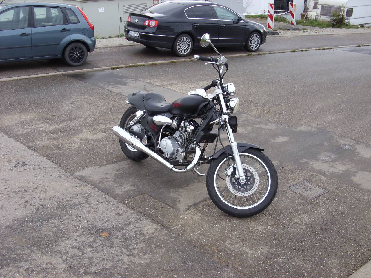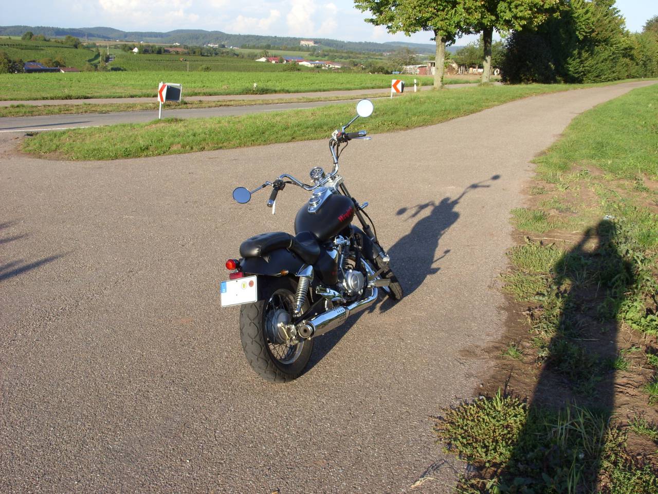 So, ich hab das schöne Wetter heute genutzt und war mal wieder mit meiner Kleinen Unterwegs und hab dann auch ein paar schöne Bilder gemacht. Im Vergleich zu den letzten Bildern gibt es noch ein paar Veränderungen. Die augenscheinlichste ist das ich den Breiten Lenker wieder abgebaut habe, da der Tüv den Lenker nicht eintragen wollte. Die Maschine sei für den 980iger Lenker zu leicht und sei zu Empfindlich für Lenkimpulse mit dem Breiten Lenker. Auch kommt man bei maximalem Lenkeinschlag mit den Lenkerenden bis an die Knie, das fand der Tüv auch nicht so toll. Hab also erstmal den Originalen wieder montiert. Für den breiten Lenker werd ich mir ein paar andere, sprich höhere, Riser holen und ich werd nen Lenkungsdämpfer dranbauen, dann dürfte auch der Tüv zufrieden sein. Das war aber auch das einzige was der Prüfer zu bemängeln hatte, daher gabs dann, mit dem Serienlenker, auch Problemlos ne Plakette für zwei Jahre. Als weitere Veränderungen sind jetzt klassische Runde Chromspiegel am Mopped, ne Werkzeugrolle aus Leder vorn, n selbstgebauter Kennzeichenhalter samt Reflektor hinten und meine Schriftzüge sind endlich drann. Seitdem die kleine getüvt und angemeldet ist bin ich, falls es nicht grade regnet, eigentlich nur noch mit dem Mopped unterwegs. Auch für den weg zur Arbeit nehm ich lieber meine Kleine als das Auto.