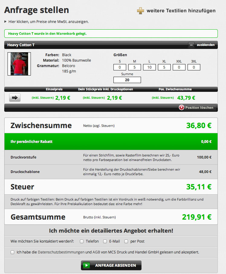 Hast du da nicht was übersehen, die verlangen für die Druckvorstufe 100€ und nochmal für die Druckschablone 48€, das wären dann 148€ die noch zu deinem errechneten Preis dazu kommen.