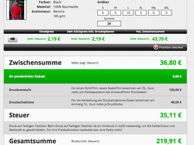 Habe mit denen noch nicht gearbeitet, aber da bekommt man laut dem Online Kalkulator, Heavy Cotton T-Shirts mit Siebdruck vorn und hinten, je 2 farbig, 20 stk schon für rund 220 € plus Versand, also 11 € das stk.