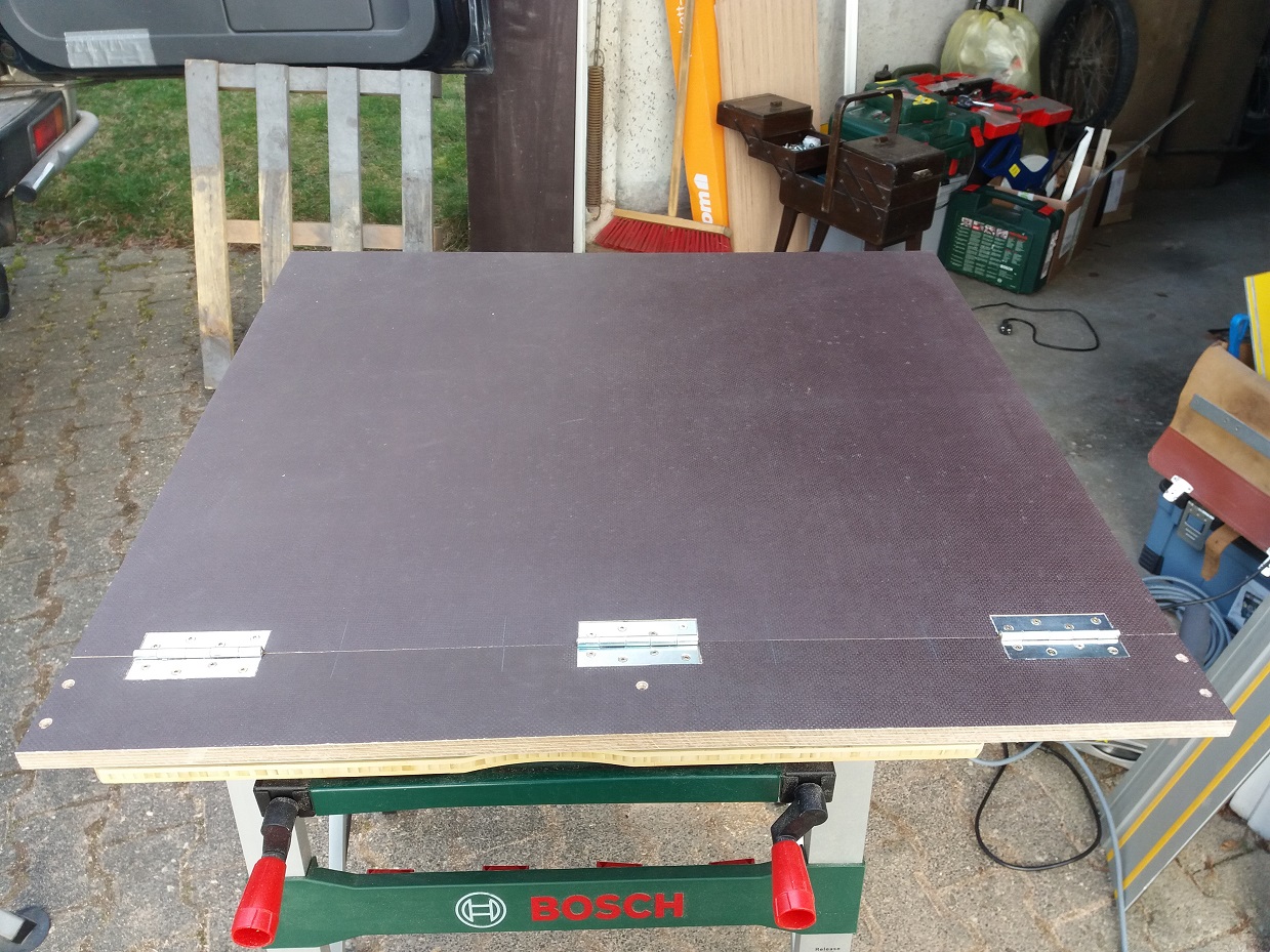Es steht jetzt noch an die Zurrschienen hinten auf der Kiste zu installieren. Die versenke ich dann wieder und nutze die Höhe als Platzhalter für die zusammengeklappten Elemente. Aufgrund der untersten Scharnierreihe liegt das Brett im zusammengeklappten Zustand eigentlich nicht ganz auf der Kiste auf. Zumindest nicht ohne Hebelwirkung auf dem Scharnier... Bilder folgen, wenn ich die Schienen verbaut habe.