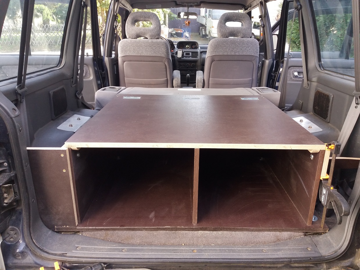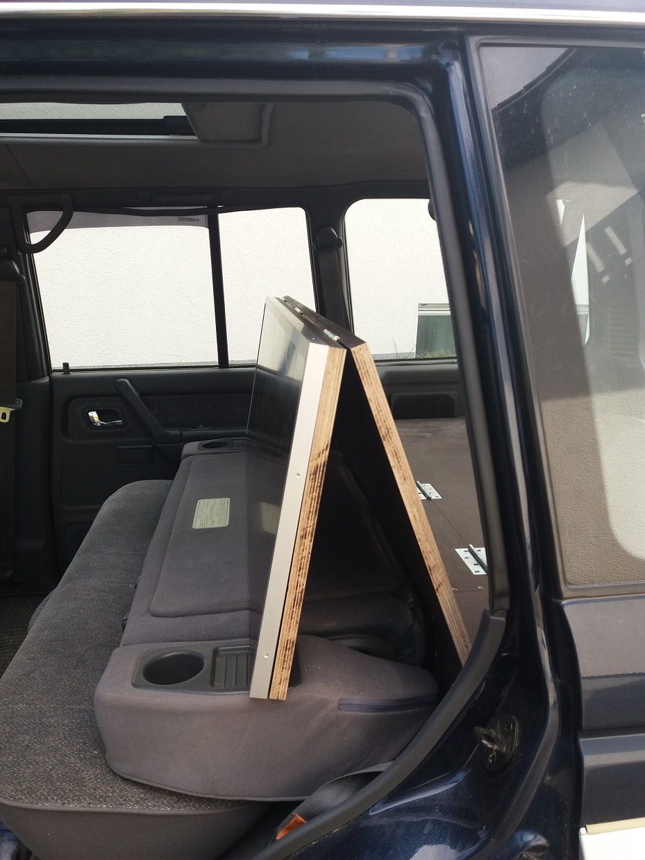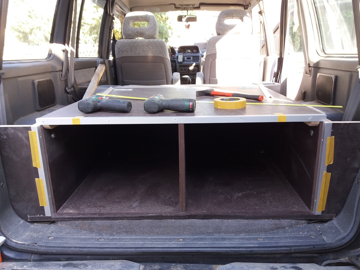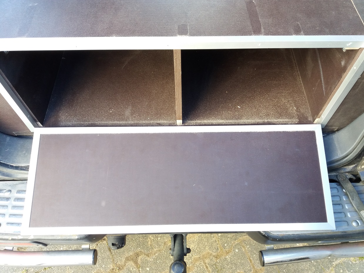 Achso, verarbeitet habe ich 18 mm Siebdruckplatten und Aluleisten. Dabei habe ich darauf geachtet, dass die raue Seite im ausgeklappten Zustand oben ist, damit die Rollmatratze fest liegt. Den Deckel der Kiste hatte ich nochmal neu gemacht, weil er bei der ersten Version zwei Zentimeter zu kurz war und mich das gestört hat. Auf den Bildern kann man das sehen.