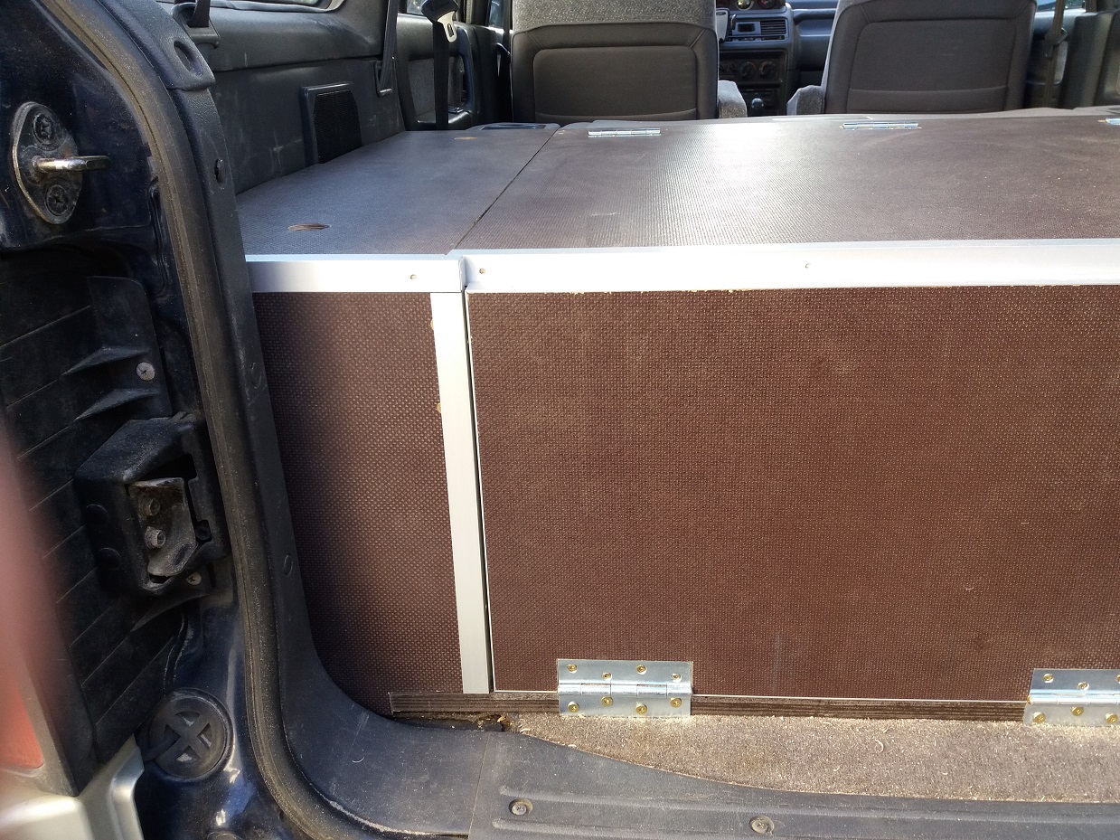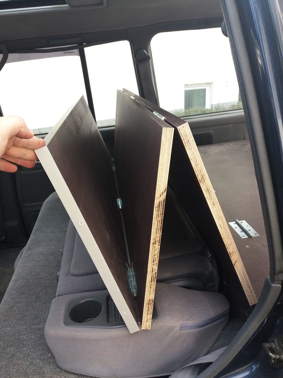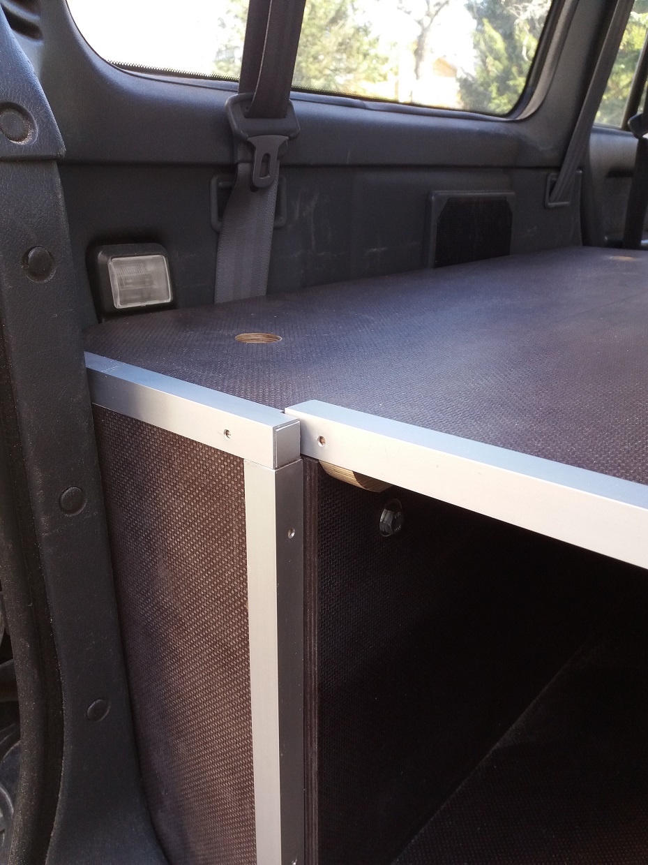 Achso, verarbeitet habe ich 18 mm Siebdruckplatten und Aluleisten. Dabei habe ich darauf geachtet, dass die raue Seite im ausgeklappten Zustand oben ist, damit die Rollmatratze fest liegt. Den Deckel der Kiste hatte ich nochmal neu gemacht, weil er bei der ersten Version zwei Zentimeter zu kurz war und mich das gestört hat. Auf den Bildern kann man das sehen.
