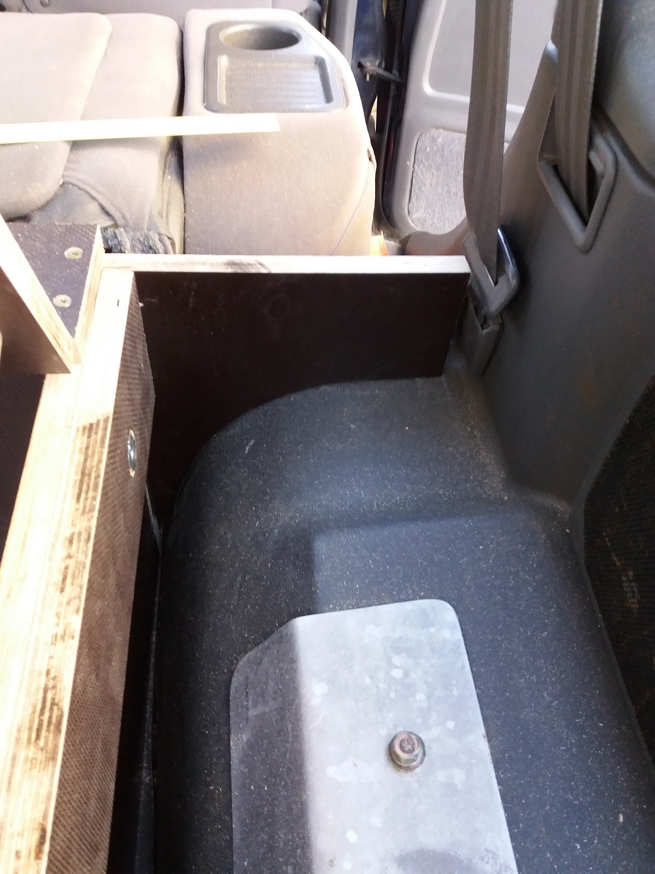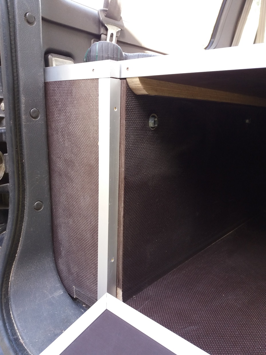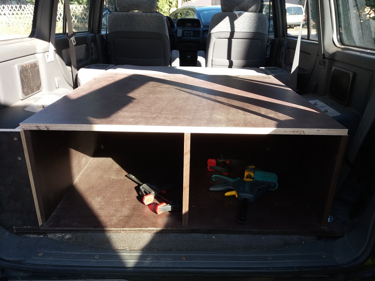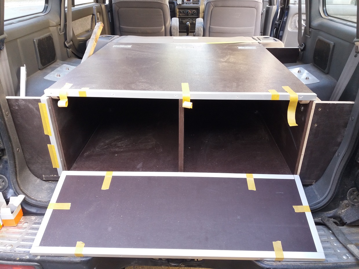 Achso, verarbeitet habe ich 18 mm Siebdruckplatten und Aluleisten. Dabei habe ich darauf geachtet, dass die raue Seite im ausgeklappten Zustand oben ist, damit die Rollmatratze fest liegt. Den Deckel der Kiste hatte ich nochmal neu gemacht, weil er bei der ersten Version zwei Zentimeter zu kurz war und mich das gestört hat. Auf den Bildern kann man das sehen.