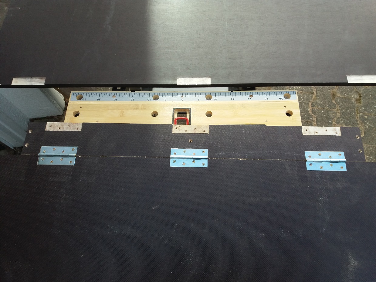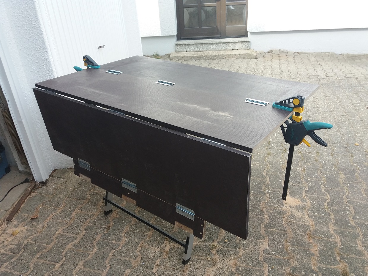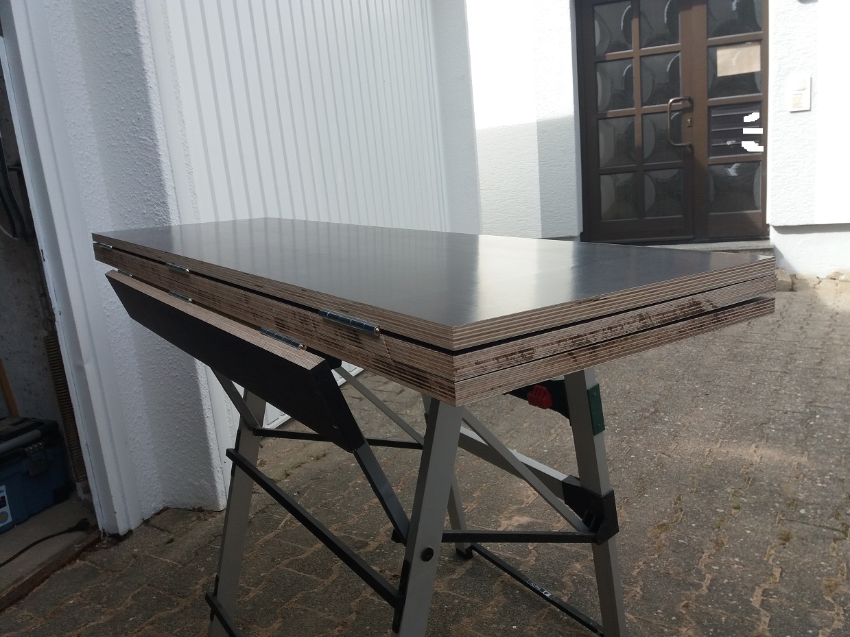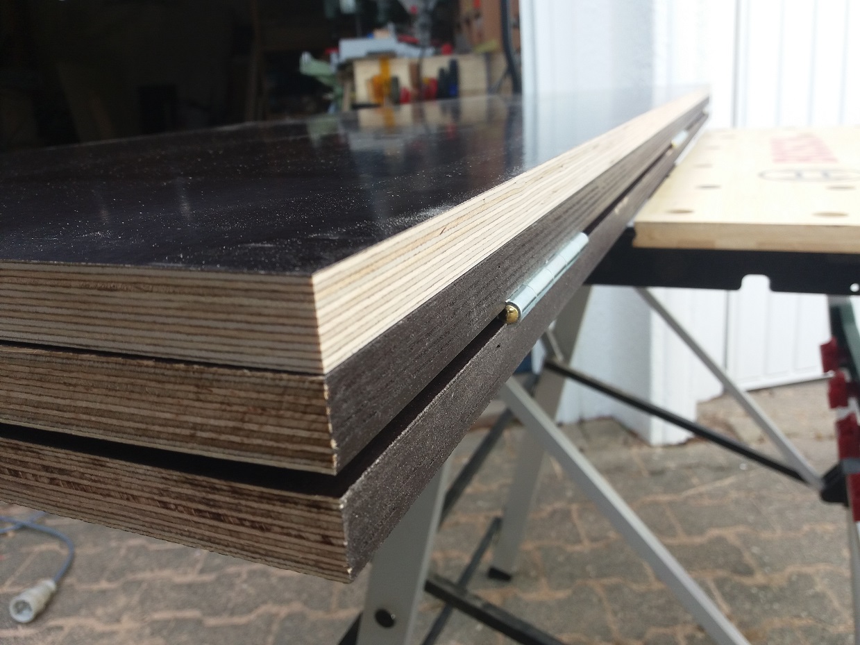 Es steht jetzt noch an die Zurrschienen hinten auf der Kiste zu installieren. Die versenke ich dann wieder und nutze die Höhe als Platzhalter für die zusammengeklappten Elemente. Aufgrund der untersten Scharnierreihe liegt das Brett im zusammengeklappten Zustand eigentlich nicht ganz auf der Kiste auf. Zumindest nicht ohne Hebelwirkung auf dem Scharnier... Bilder folgen, wenn ich die Schienen verbaut habe.