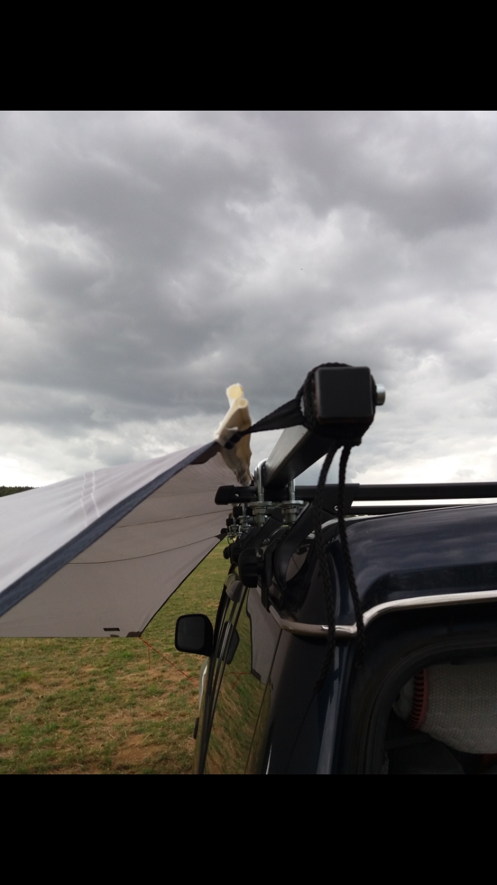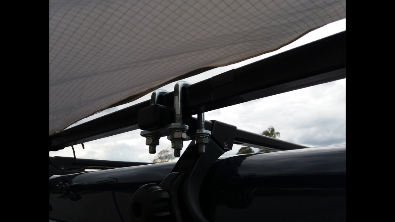 Achso, die Markise ist von Reimo. Das Modell heißt Mauritius XXL. Habe sie zwischenzeitlich aber schon verkauft. Normalerweise ist die über eine Kederschiene und oder Schlaufen mit Saufnäpfen zu befestigen. Ich hatte sie mit den Schlaufen an einem langen Vierkantrohr befestigt. Das Vierkantrohr war in Meterstücke teilbar und wurde mit Bügelschrauben an den Dachträgern befestigt.