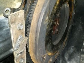 So, Schwungrad ist runter, hab mir wie bereits geschrieben aus Alteisen schnell einen "Schwungradblockierer" zusammengeschweißt. Sieht nicht schön aus, aber funktioniert, siehe Bilder.