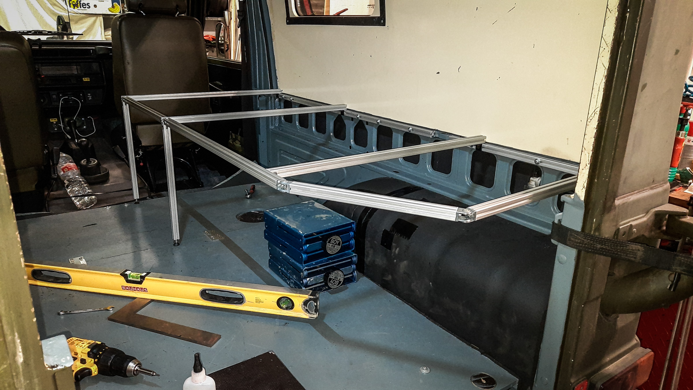 Zum Abschied hat mich Gero noch über ne Holperpiste gejagt, die Konstruktionsprobleme gnadenlos zum Vorschein gebracht hätte. Die ganze Karre ist wie ein Hase gesprungen und alles hat gerappelt und geklappert. Der Alukram hielt aber und tatsächlich klappert da nichts zusätzlich durch die Konstruktion. Hätte ich sooo gut gar nicht erwartet. Also fürs erste bin ich happy mit den Einbau. Jetzt könnte mal langsam die Batterie ankommen, damit ich weitermachen kann.