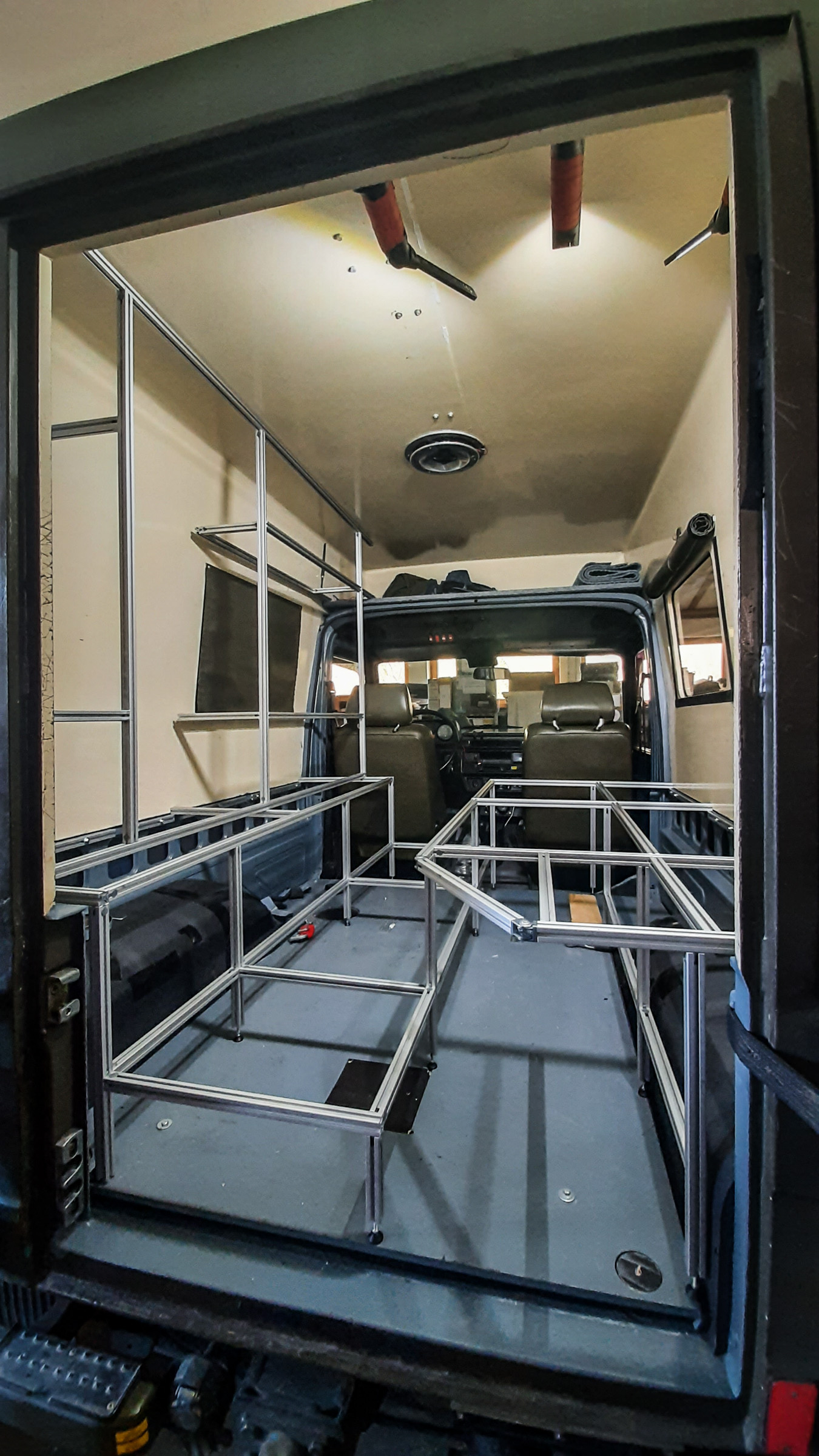 Einnietmuttern in die vorhandenen Löcher. An den richtigen Stellen die passenden Löcher in die Aluprofile gebohrt und schon hing die erste Leiste am Puch. Ok, klingt jetzt schneller als es tatsächlich voran ging. Aber der Anfang war gemacht und am Abend des ersten Tages sah es so aus: