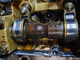 Bei dem Motor läuft die Nockenwelle auf Rollenlagern. Heisst, die Nocke drückt auf ein Lager im Schlepphebel, der Schlepphebel drückt das Ventil auf. Hier hat dass Rollenlager gefressen und sitzt fest. Deswegen schleift die Nocke jetzt über den festsitzenden äußeren Lagerring und ist so heiß geworden dass sie blau ist. Der Hydrostößel wird das größere Spiel nicht ausgleichen können und das ergibt dann ein Klackergeräusch. Ob es nun euer Geräusch ist, weiß ich natürlich nicht.