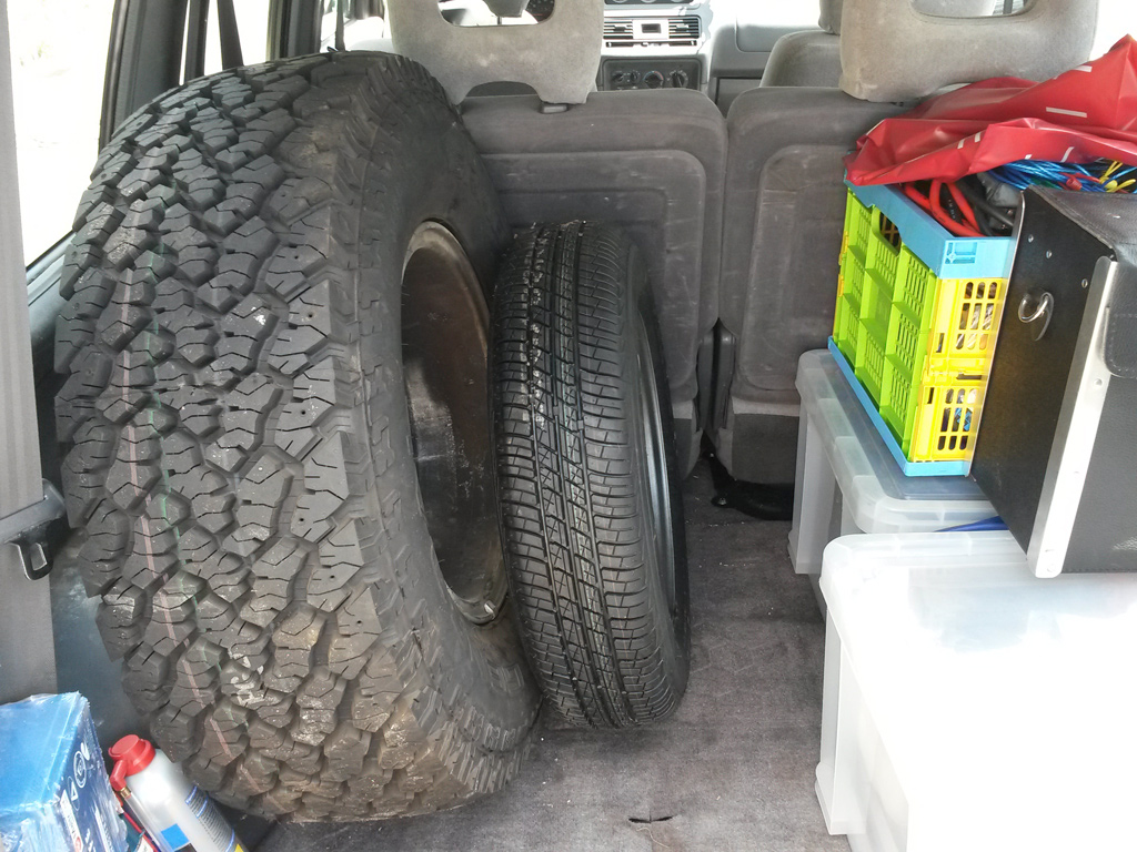 Hmm - irgendwie find ich so ein Rad vom Pajero vertrauenserweckender als ein Rad vom Hänger... (Und das ist mit 155 / 75 / 13 ja das Standardmaß bei Hängern bis 1,5 Tonnen...)
