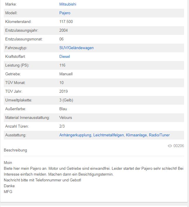 Den Pajero vom Mc Schnödie gab es seinerzeit für nen Schnapper... Jetzt ein paar Kilometer später und sicher nicht in besserem Zustand gibbet dat Teil für sagenhafte 8500 mit ner sinnlosen Geschichte von Namibia dazu........