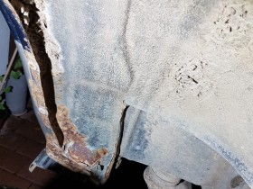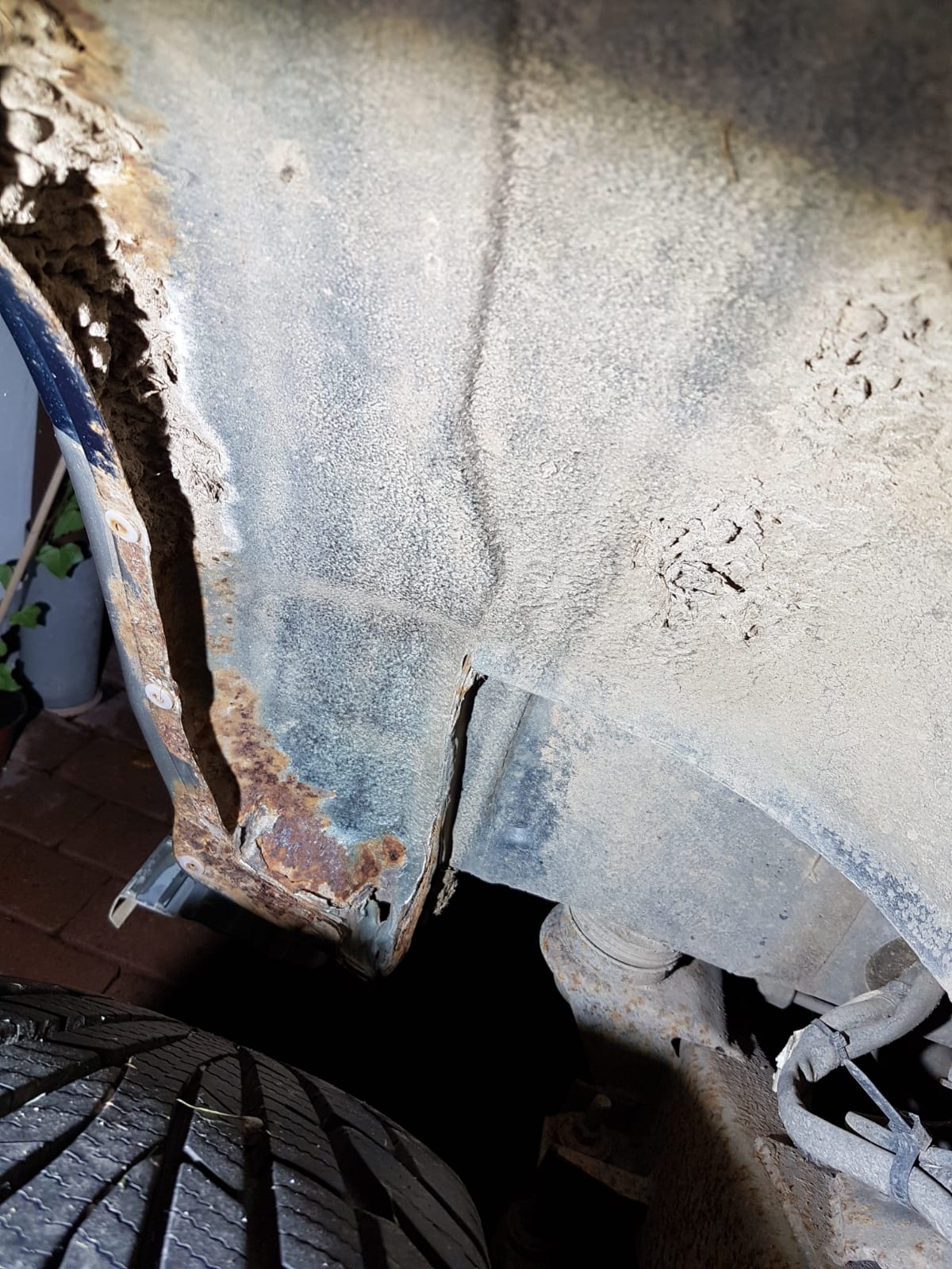Der Schweller Fahrerseite muss auf jeden Fall komplett neu. Unter der Einstiegsleiste ging die Rostmisere deutlich weiter. Schweißarbeiten am Unterboden sind in Ordnung, allerdings werden in zwei Jahren wohl nochmal Schweißarbeiten fällig, damit er den nächsten TÜV auch besteht. Einige Stellen am Rahmen sind recht dünn...