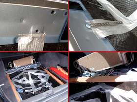 Kofferraumboden leerräumen, Wanne mit doppeltem Boden ausbauen, Ersatzrad raus, Kofferraumboden und Reserveradmulde dämmen (separater Arbeitsgang, wichtig!, Gummimuffe für Muldenentwässerung nicht zukleben). Am Querträger unter der Heckklappe habe ich einen Lochstreifen in einem vorhandenen Loch festgeschraubt, dessen Funktion wird später erklärt.
