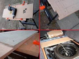 Zur Unterdrückung von möglichen Schwingungen des 12er MDF Materials habe ich als zweite Schicht noch eine 8er Platte untergeschraubt. Das Reserverad wird schon mal probeweise eingelegt, wichtig ist dabei, daß das Innere der Felge nach oben zeigt, weil dort hinein später der Lautsprecherkorb Platz benötigt.