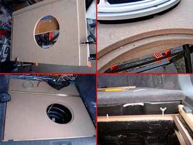 Jetzt kommt die Platte für den Sub. Zu deren Verstärkung habe ich eine zweite 12er MDF Platte untergeschraubt. Am Einbauort des SUB werden zwei Kreisrunde Löcher gesägt. In die obere Platte entsprechend dem Außendurchmesser des Korbes des zu verbauenden SUBs und in die untere Platte entsprechend der Einbauöffnung des SUBs. Das Ganze hatt den Sinn, den SUB versenkt und Bündig mit der Oberseite der Platte zu montieren.