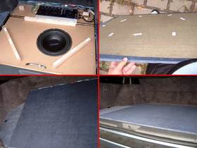Damit der Kofferraum voll nutzbar bleibt, brauchen wir noch eine Platte, die unseren Einbau verdeckt. Ich habe 10er MDF mit Alcantara bezogen, nicht ohne auf der Oberseite vorher noch Polsterstoff zu verarbeiten. Die Platte deckt nicht die ganze Fläche ab, sondern es bleibt eine Schattenfuge in der Nähe der Sitzlehnen, wo der Schall austreten kann. Wichtig dabei ist, diese Fuge nicht zu schmal zu bauen, sonst kommt es zu Kompressionseffekten, weil man praktisch einen Bandpass gebaut hätte....