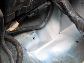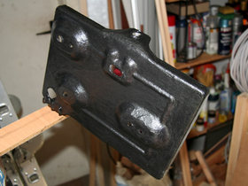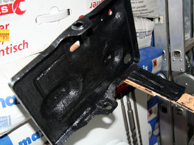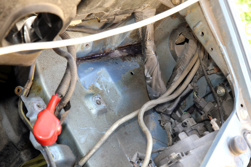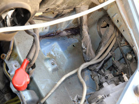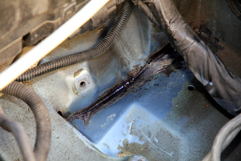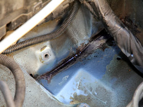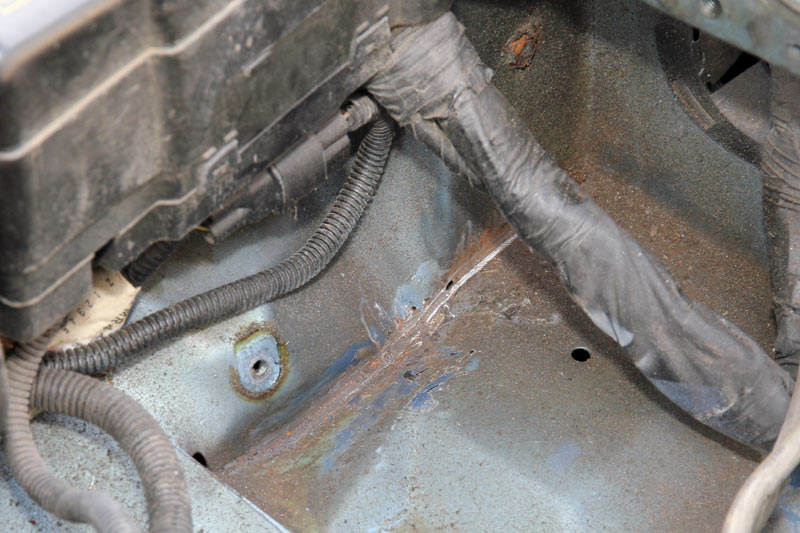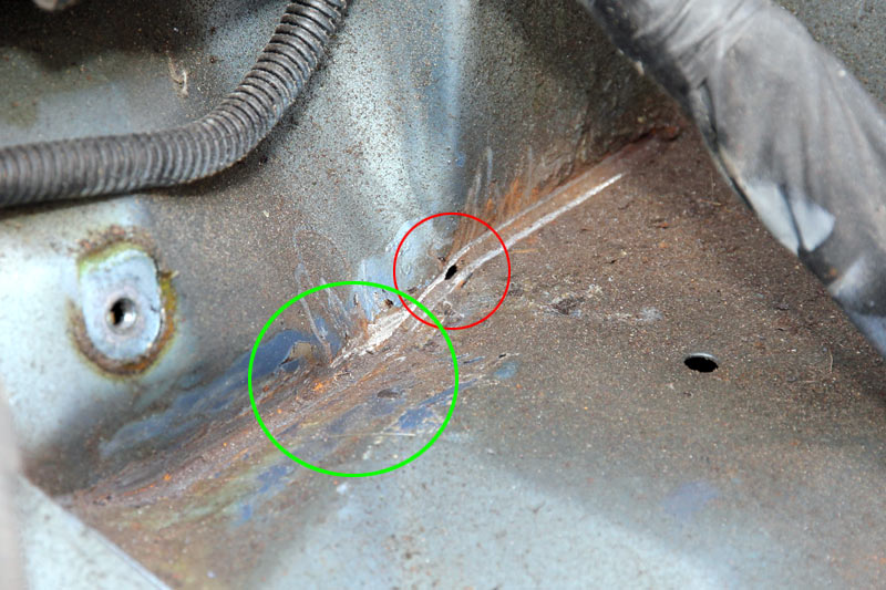 Mal wieder hausgemacht das Problem. So langsam möchte man den Konstrukteuren nachträglich auf die Finger hauen. Was muß man machen, wenn man ein Blech vorsieht, wo Wasser und Schmutz stehen bleiben können? Richtig, eine Entwässerung vorsehen. Ungefähr dort, wo im Bild das Zentrum des grünen Kreises ist. Macht man das nicht, geht der Rost den Weg des geringsten Widerstandes äh, der geringsten Materialdicke (roter Kreis).