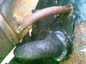 Wahrscheinlich ist der Rohrbogen schon länger durch und der Vorbesitzer hat den Schlauch einfach weiter draufgeschoben und eingeklebt.