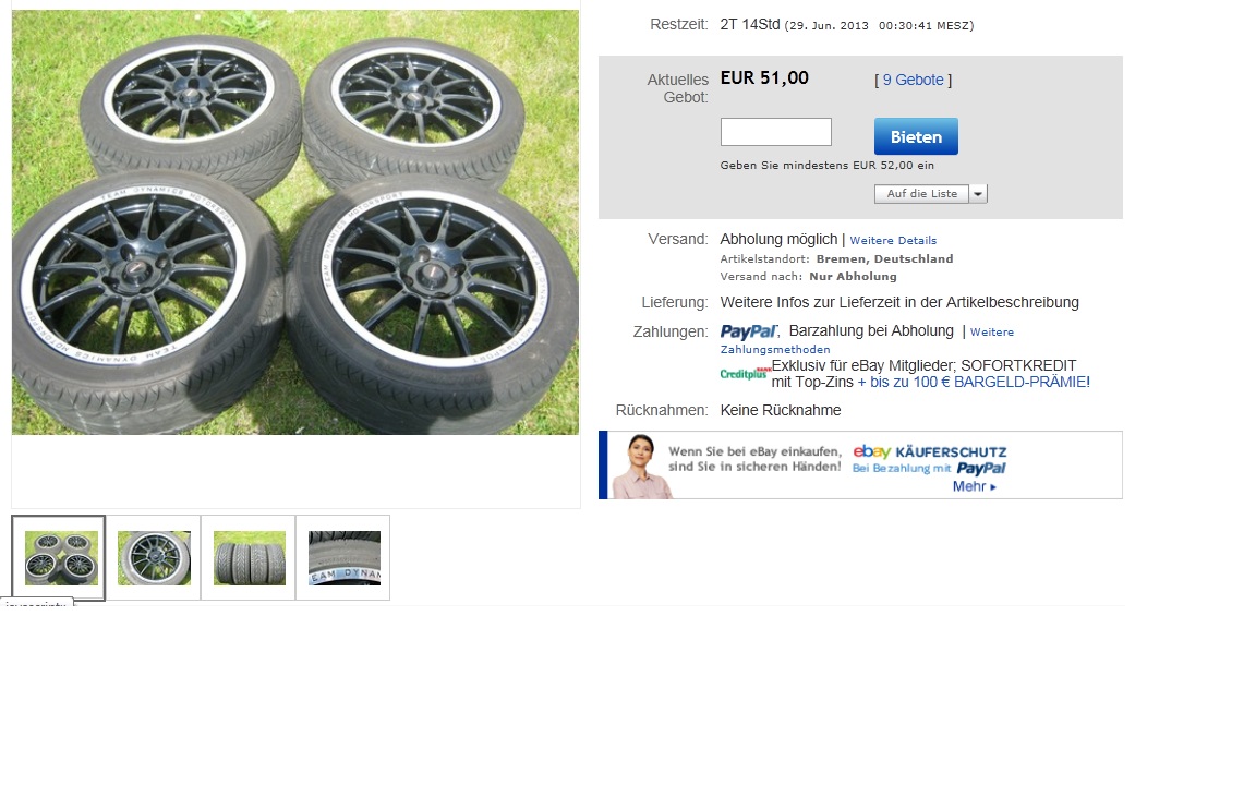 Ich sags mal so. Den gebrauchten Satz Team Dynamics Felgen ohne Reifen bekommt man schon für 300 €. Das ist echt nicht zu viel. Ich hab da paar silberne im Blick. Aber auch hier bei ebay sind welche ab 1 €. Die waren lange erst mit Startgebot von 300 € inseriert. Da hat aber niemand drauf geboten gehabt.